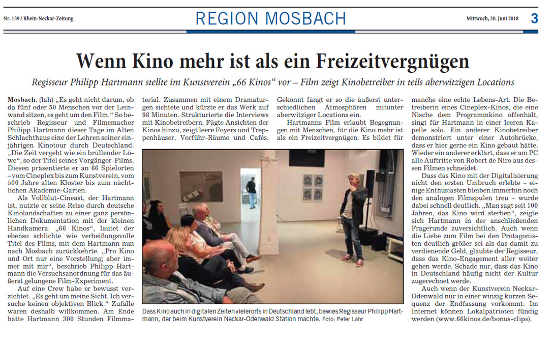 Am 19. September 2015 zeigten wir im Alten Schlachthaus in Mosbach den Essayfilm von Philipp Hartmann „Die Zeit vergeht wie ein brüllender Löwe“. Damit wurde unser Kunstverein ein Kandidat für den Film „66 Kinos. Eine Reise durch die deutsche Kinolandschaft“. Denn in diesem neuen Dokumentarfilm berichtet Philipp Hartmann von Besuchen bei deutschen Kinos und anderen Filmspielstätten, in denen er bei seiner Kinotournee 2014/2015 „Die Zeit vergeht wie ein brüllender Löwe“ zeigte. Mit „66 Kinos“ ist ein Essay entstanden, der von persönlichen Begegnungen und Erfahrungen geprägt ist. Dieser Film beschreibt den Status quo der deutschen Kinokultur und denkt dabei über den Stellenwert des Kinos als gesellschaftlichem Ort heute und in der Zukunft nach.