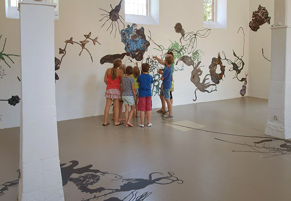 Eine Kindergruppe vom Spiel-Mobil im Kraichgau erkundete die Ausstellung “Superspezies” von Dagmar Hugk bei einem Ausflug nach Mosbach, dabei von Birgit Schwarz begleitet. Birgit Sommer, die Ausstellungskuratorin, führte in die Ideen und Absichten der Künstlerin ein.