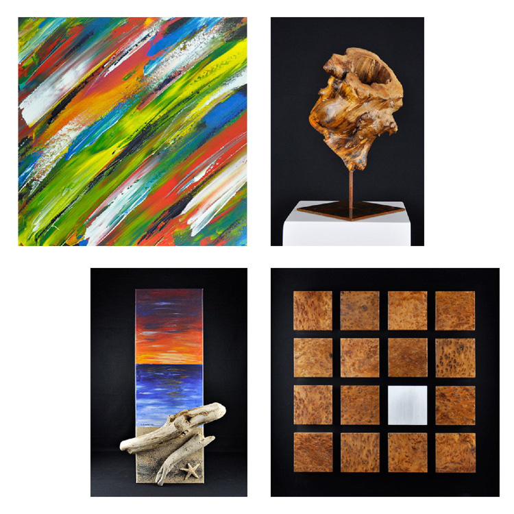 Acrylgemälde, Holzskulpturen, Materialcollagen, Bild/Holzcollagen