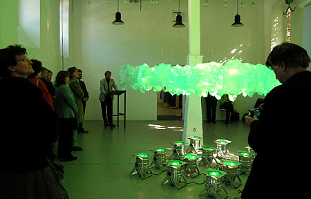 Rhein-Neckar-Zeitung, 16. September 2010: Poesie in Grün verwandelt das „Alte Schlachthaus“ - Monika Linhards Rauminstallation bringt Tüten zum Flüstern hier klicken