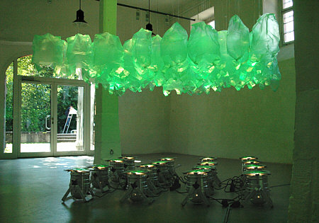 Eigens für das Alte Schlachthaus Mosbach hat Monika Linhard ihre Rauminstallation „Tütengeflüster“ konzipiert und auf die Räumlichkeiten abgestimmt. Floorspots tauchen ihre hauchdünnen Plastiktüten in transzendent algig-grünliches Licht. Das durch die Thermik evozierte Zappeln und Wabern lässt den Assoziationen freien Lauf. Das Lichtspiel und die Leichtigkeit der Bewegungen lassen uns in einen Erlebnisraum der besonderen Art eintauchen.