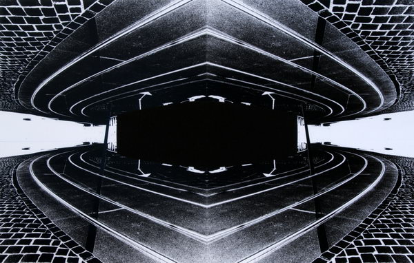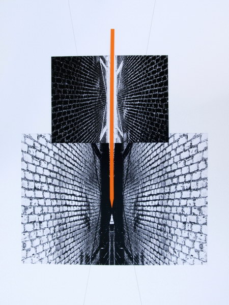 In der Kombination der bildtechnisch bearbeiteten und auf Fotokartons kopierten Papiere entstehen verblüffend räumliche Anmutungen. Verwandlung von geometrischen Straßenzeichen in „neue“ zweidimensionale Gebäudeformationen, die es zu entdecken gilt.