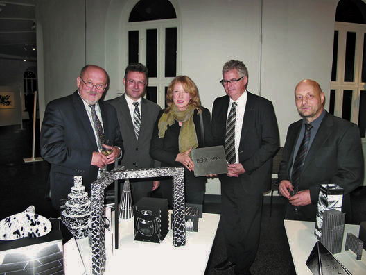 Bei der Vernissage in Görlitz hinter dem 'Stadtmodell': OB Siegfried Deinege, Landrat Dr. Achim Brötel, Ulrike Thiele, Landrat Bernd Lange und Kulturreferent Joachim Mühle