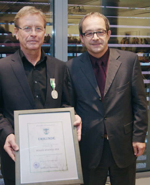 Vernissage der Ausstellung “Schaffens(t)räume” - Werner Zeh empfängt von Bürgermeister Burger die Verdienstmedaille der Stadt Buchen